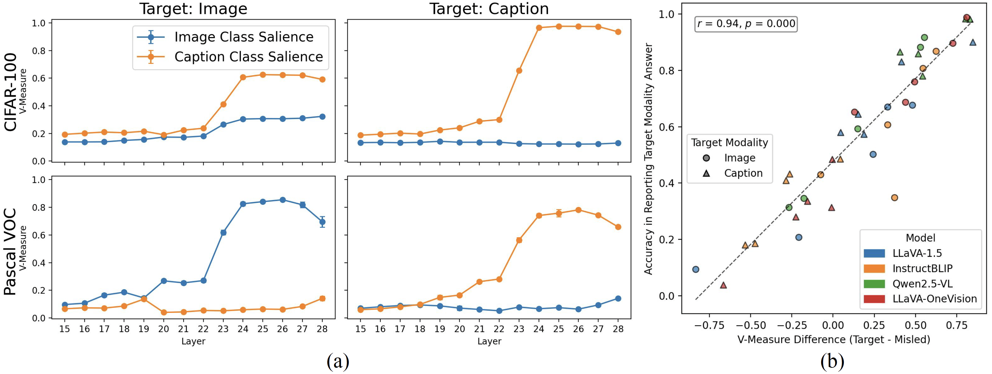 Representational salience and behavioral accuracy. (a) Layer-wise V-Measure of Qwen2.5-VL representations with regard to the image and caption labels of the inconsistent samples, on CIFAR-100 (top) and Pascal VOC (bottom); in CIFAR-100, captions are always encoded more saliently regardless of the target modality, which leads to a degraded performance for Qwen2.5-VL to report image informtion. In contrast, Qwen2.5-VL (re)organizes its representations in Pascal VOC to always align the target modality more saliently. (b) Across all model–dataset–task triples, the V-Measure gap (target − misleading) strongly predicts accuracy on the target modality (r = 0.94 , p < 0.001). In all, these patterns suggest that (1) models which perform poorly fail to (re)-organize their internal representations of the inputs in a way that is responsive to the instruction. (2) This ability to (re)cluster the inputs appears to be correlated with performance in general, across models and datasets. |
