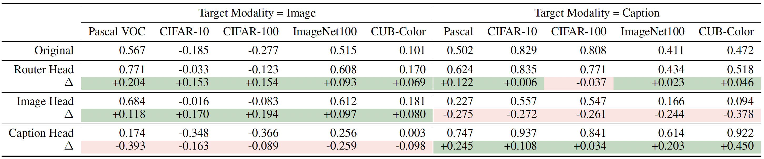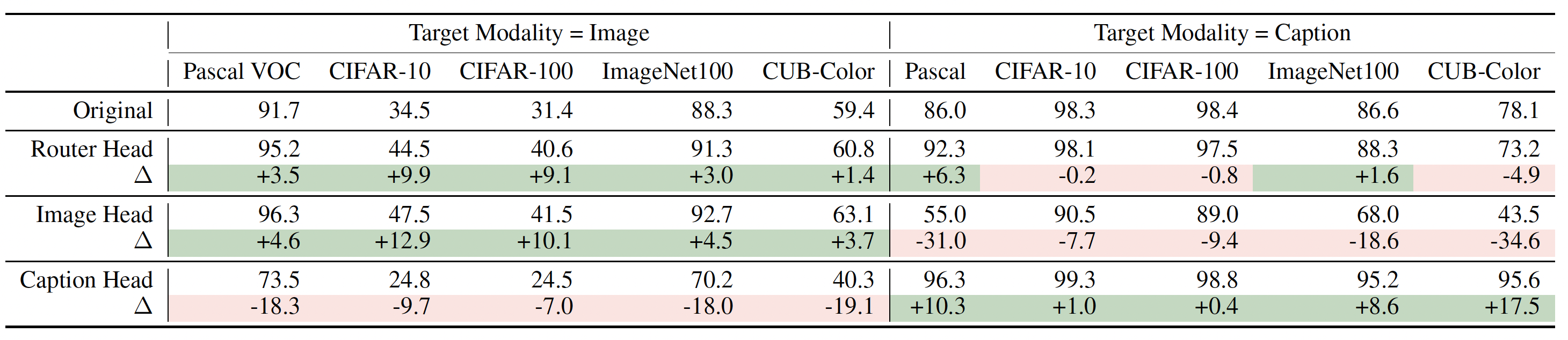 Cross-dataset generalization of modality-agnostic router head (L11H14), image promotion head (L19H26), and caption promotion head (L13H26) of Qwen2.5-VL. Δ computes the difference between the original model performance and the model performance with an attention head intervened. The router head can generalize across majority of the tasks, except CUB-Color. The image/caption promotion heads invariantly improve model's capability on reporting the corresponding modality's information. |