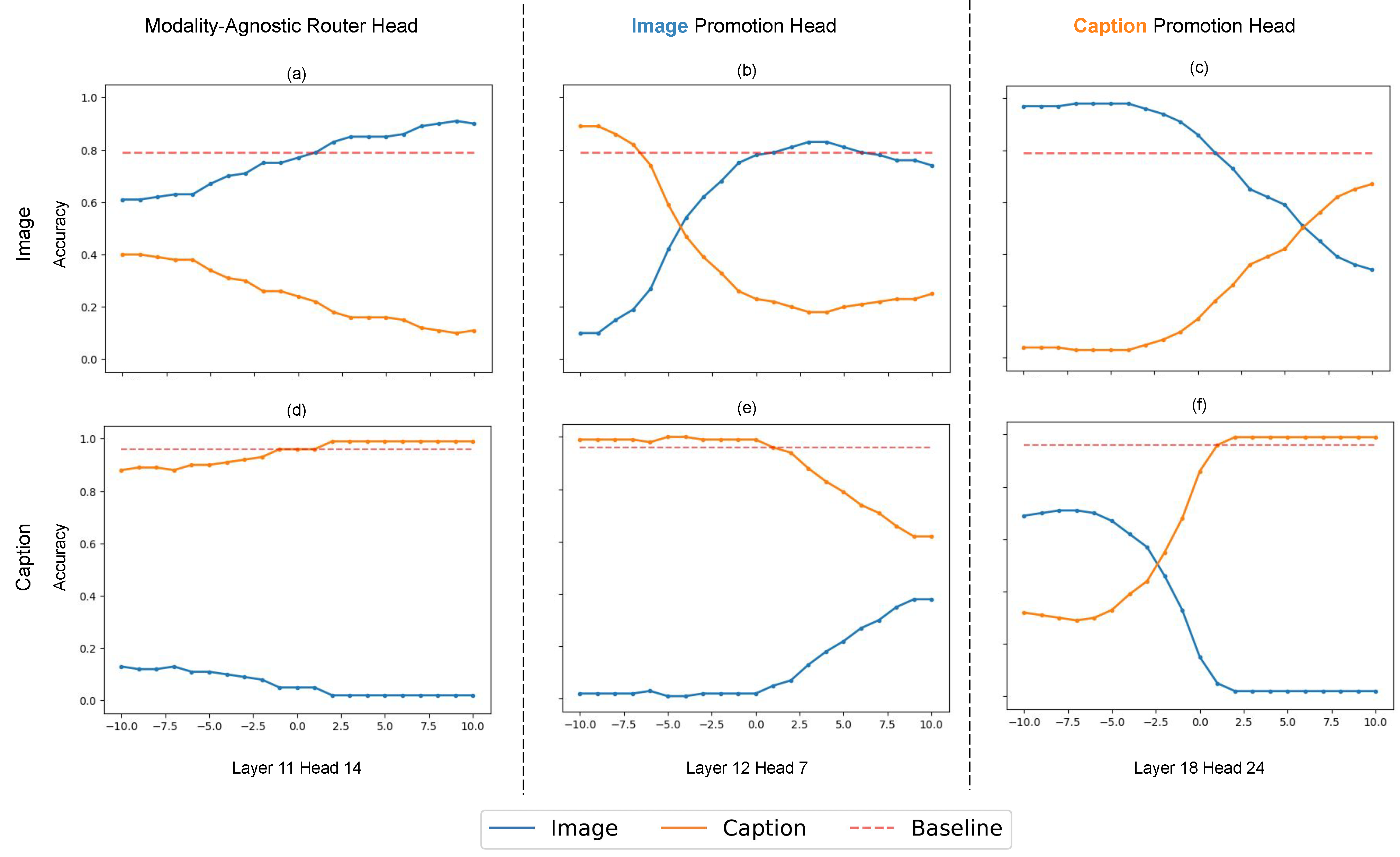 (1) Modality-agnostic router head promotes the answers corresponding to the target modality; (2) Image promotion head always promotes the answers about image information; (3) Caption promotion head always promotes the answers about caption information.. |