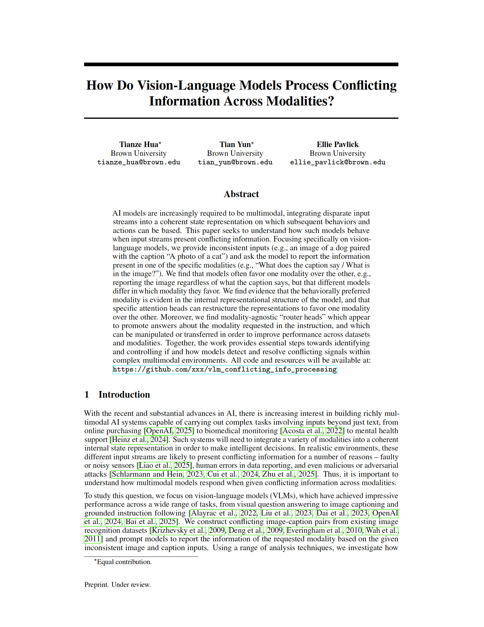 Tianze (Etha) Hua*, Tian Yun*, Ellie Pavlick. How Do Vision-Language Models Process Conflicting Information Across Modalities? Under Review. |