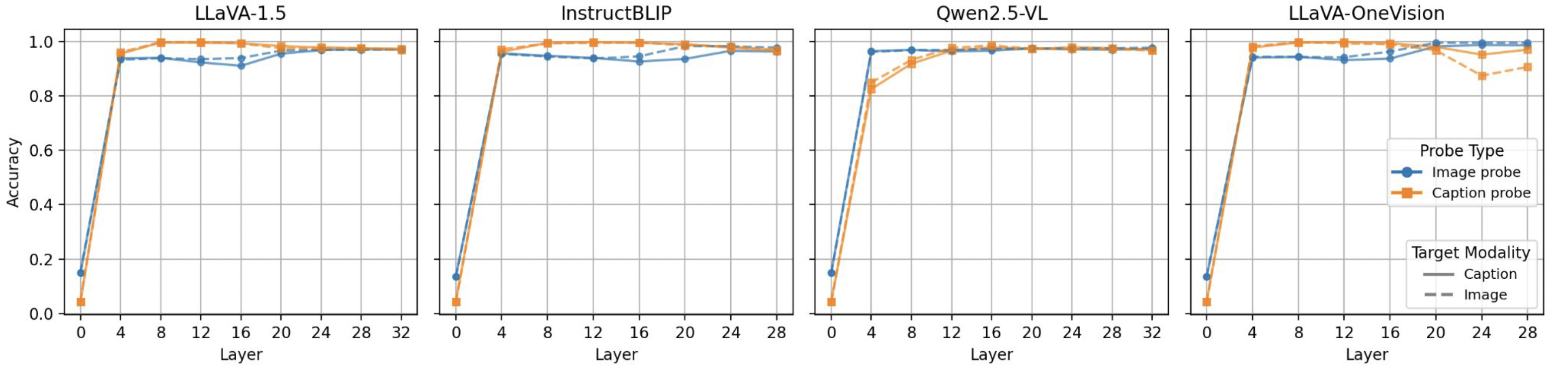 Accuracy of unimodal information probe on Pascal VOC dataset. Probe accuracies remain high on unimodal information probe on the last layers, indicating that VLMs can sufficiently encode the information of each modality. |